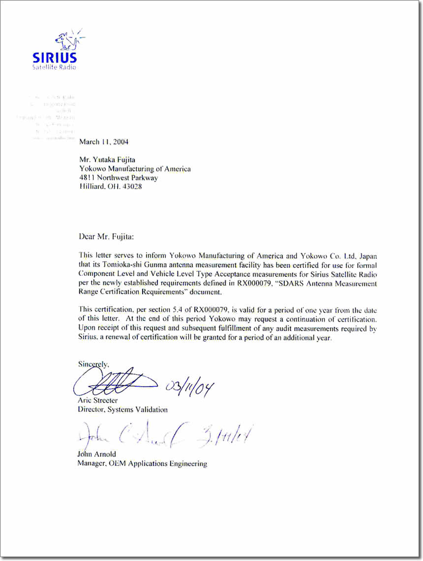 株式会社ヨコオ殿に納入された弊社製電波暗室は米国の衛星ラジオシリウスの測定サイトとして世界で初めて登録されました。